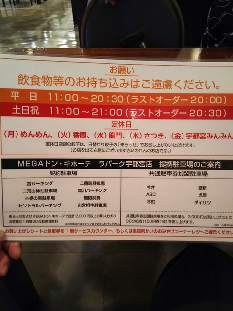 店舗情報 住所 〒 栃木県宇都宮市馬場通り2312 tel fax 営業時間 900~2300 定休日 なし アルバイト・パート求人情報宇都宮餃子めんめん MEGAドン・キホーテ ラパーク宇都宮 来らっせ店(メンメン メガドンキホーテ ラパークウツノミヤテン キラッセテン) 所在地 〒 栃木県宇都宮市馬場通り2312 MEGAドン・キホーテ ラパーク宇都宮内 観光MAP 来らっせ本店 住所宇都宮市馬場通り2312 MEGAドン・キホーテ ラパーク宇都宮店地下1階 営業時間 平日 1100~30(LO00) 土日祝 1100~2100(LO30) ※日替わり店舗は金・土・日曜日のみ23時まで営業 こちらの記事もおすすめ 宇都宮駅おすすめ餃子